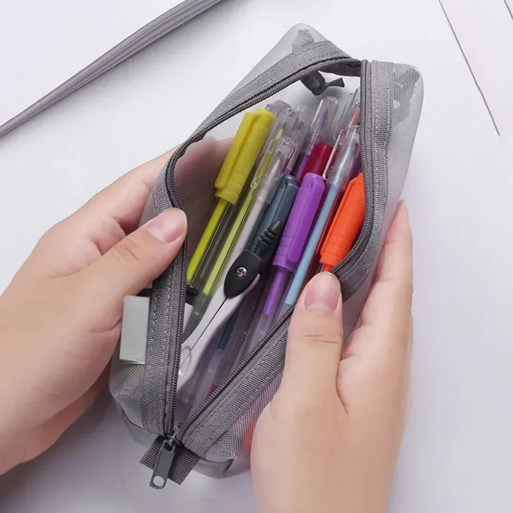 깔끔한 디자인에 속이 보여 실용적인 투명 메쉬 필통! 가볍고 튼튼해서 휴대하기 좋고, 내용물 정리도 쉬워요.