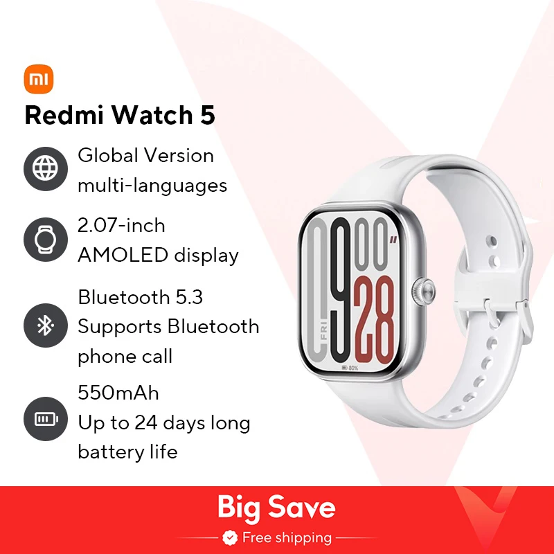 Xiaomi redmi watch 5 versão global 2.07 “60hz tela amoled embutida gnss bluetooth chamada mais de 150 modos esportivos 24 dias de vida útil da bateria